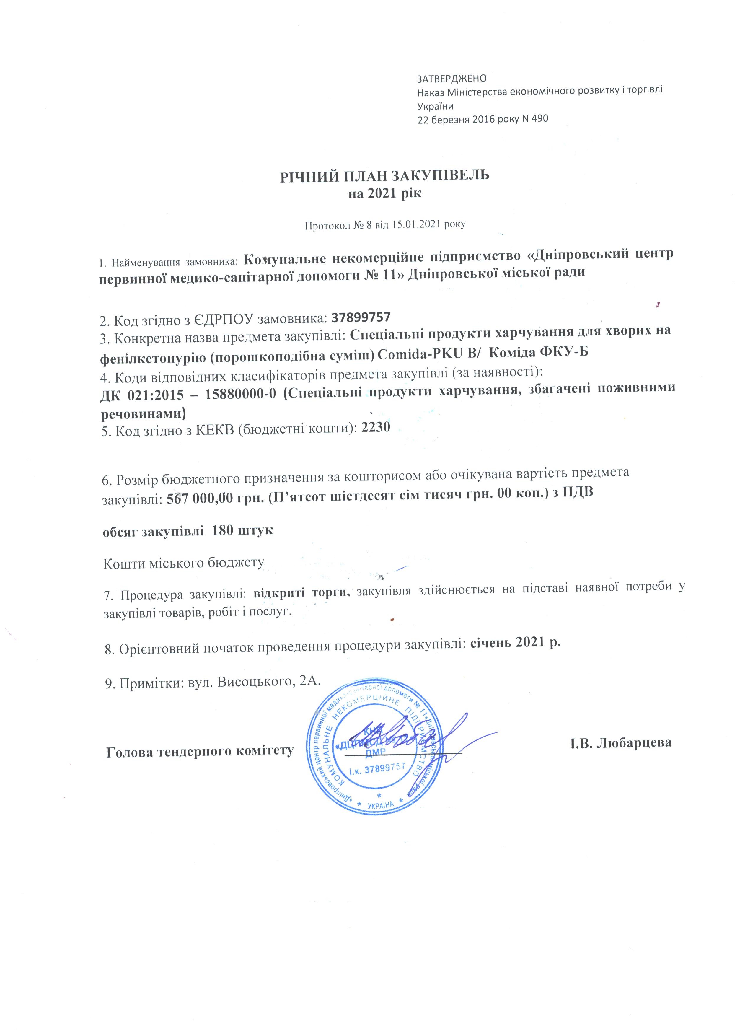 Річний план закупівель на 2021 рік Спеціальні продукти харчування
