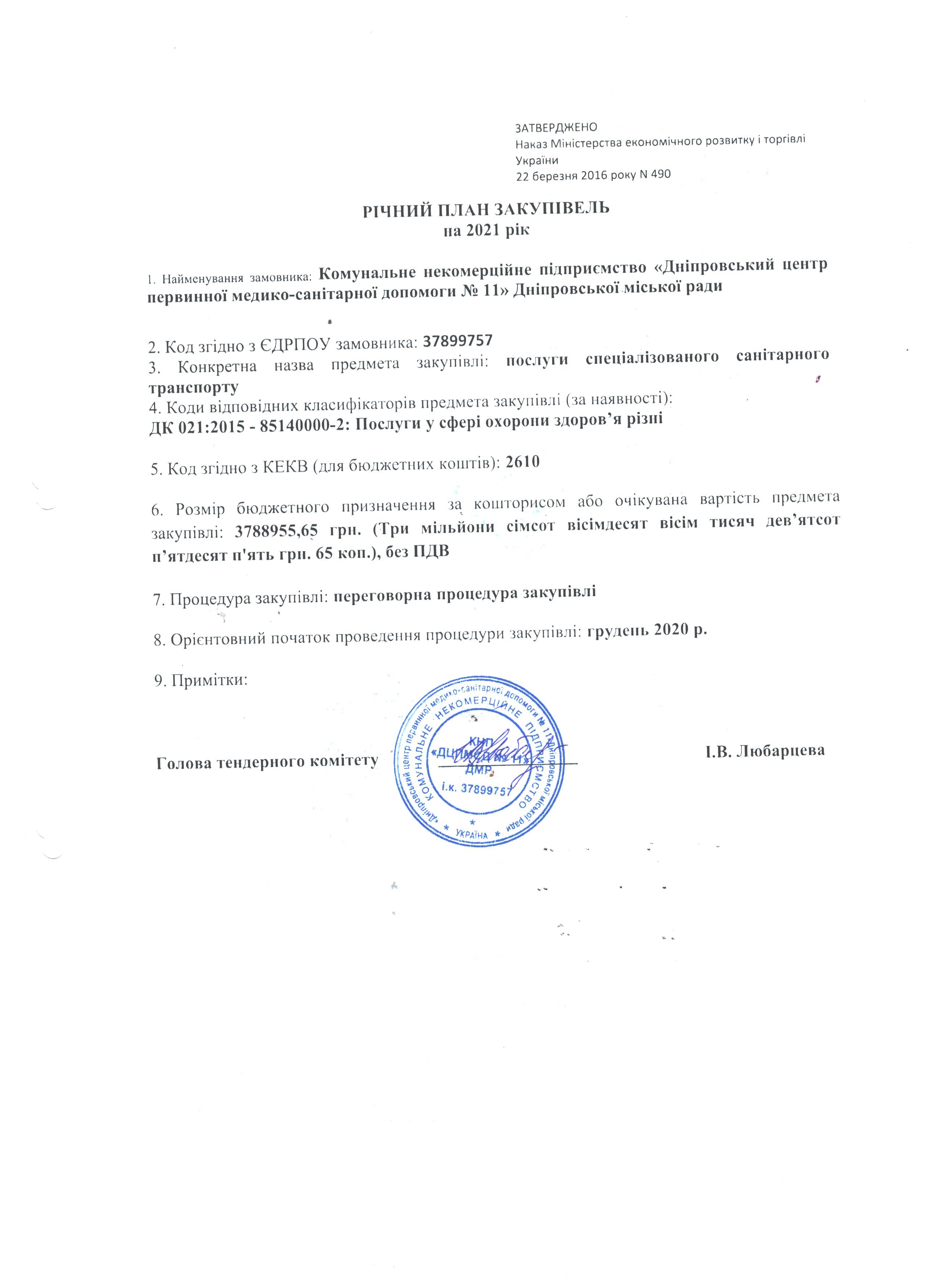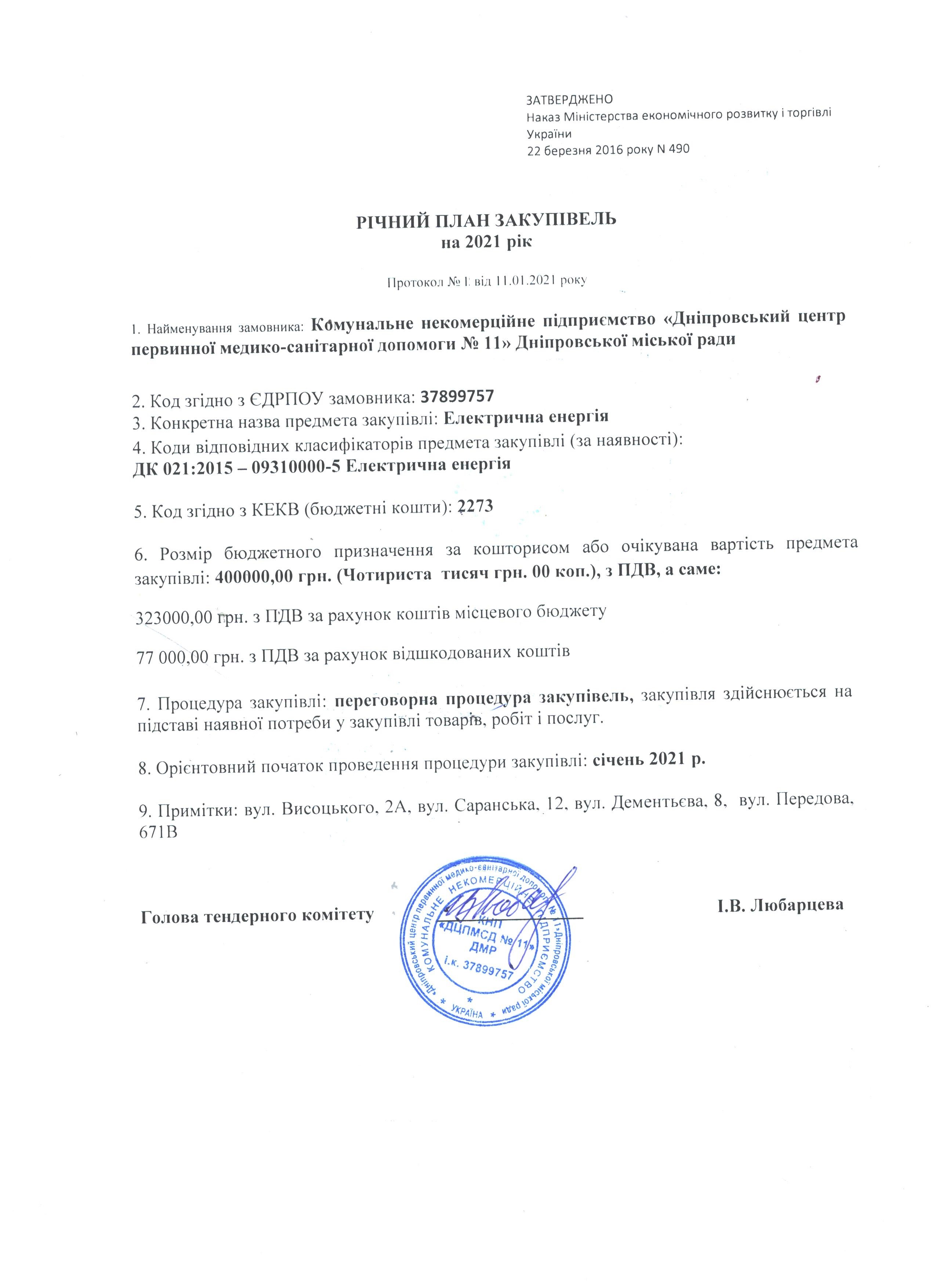 Річний план закупівель на 2021 рік Послуги у сфері охорони здоров’я різні