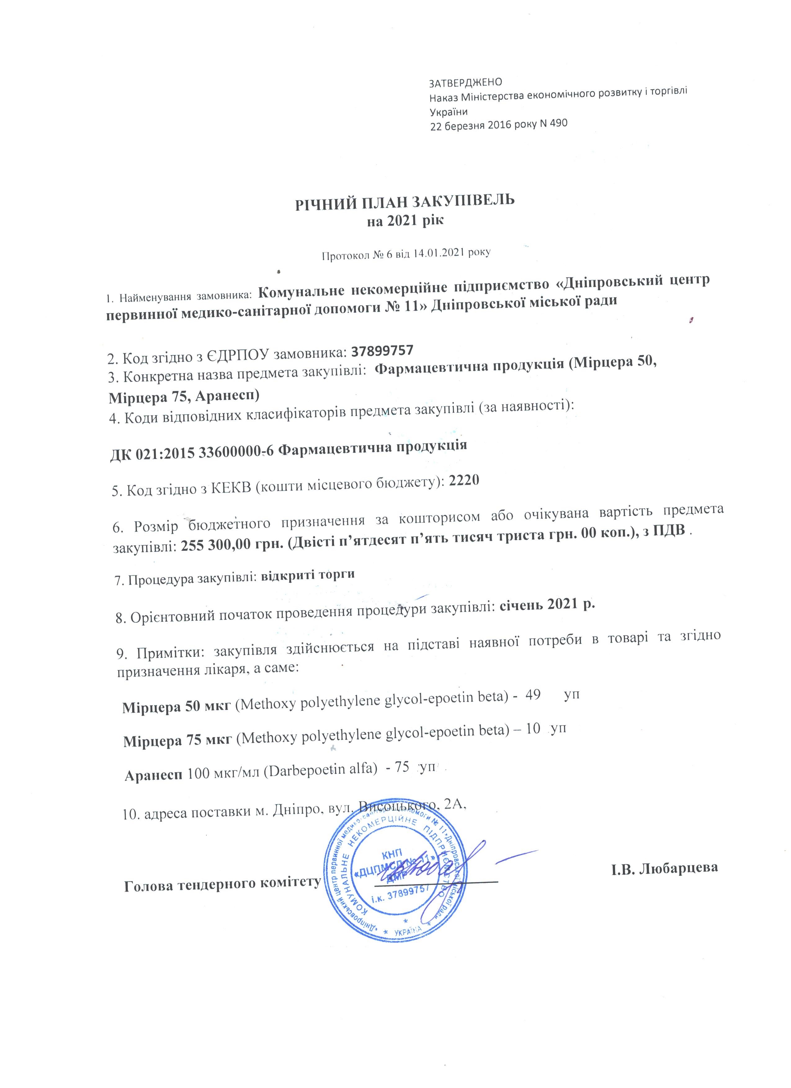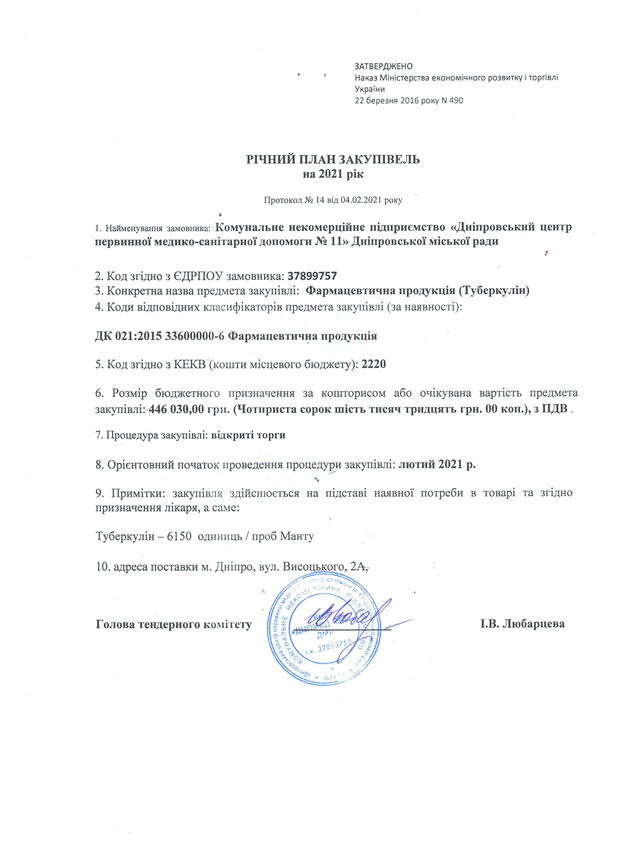 Річний план закупівель на 2021 рік Фармацевтична продукція