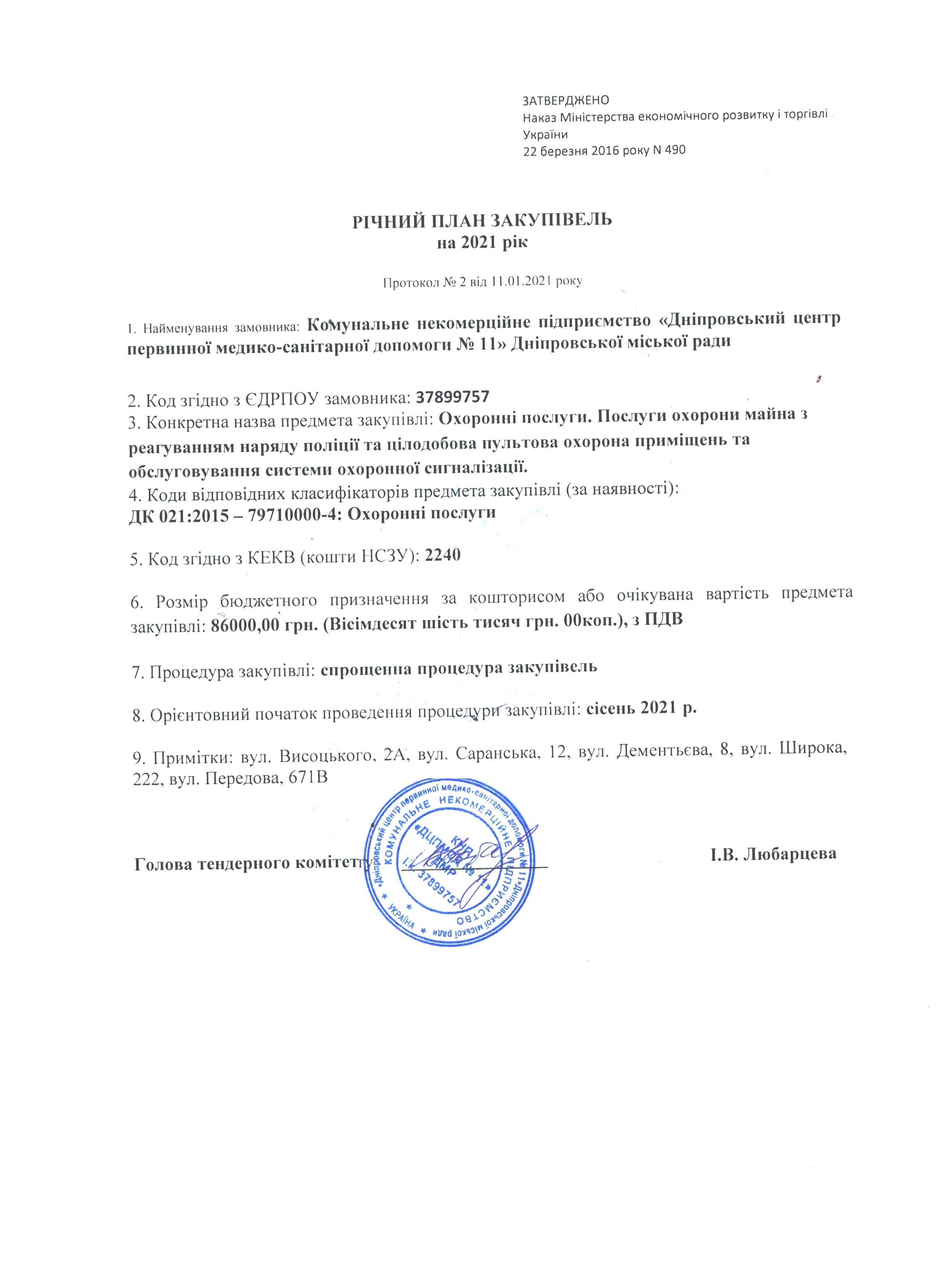 Річний план закупівель на 2021 рік ДК 021:2015 79710000-4 Охоронні послуги и