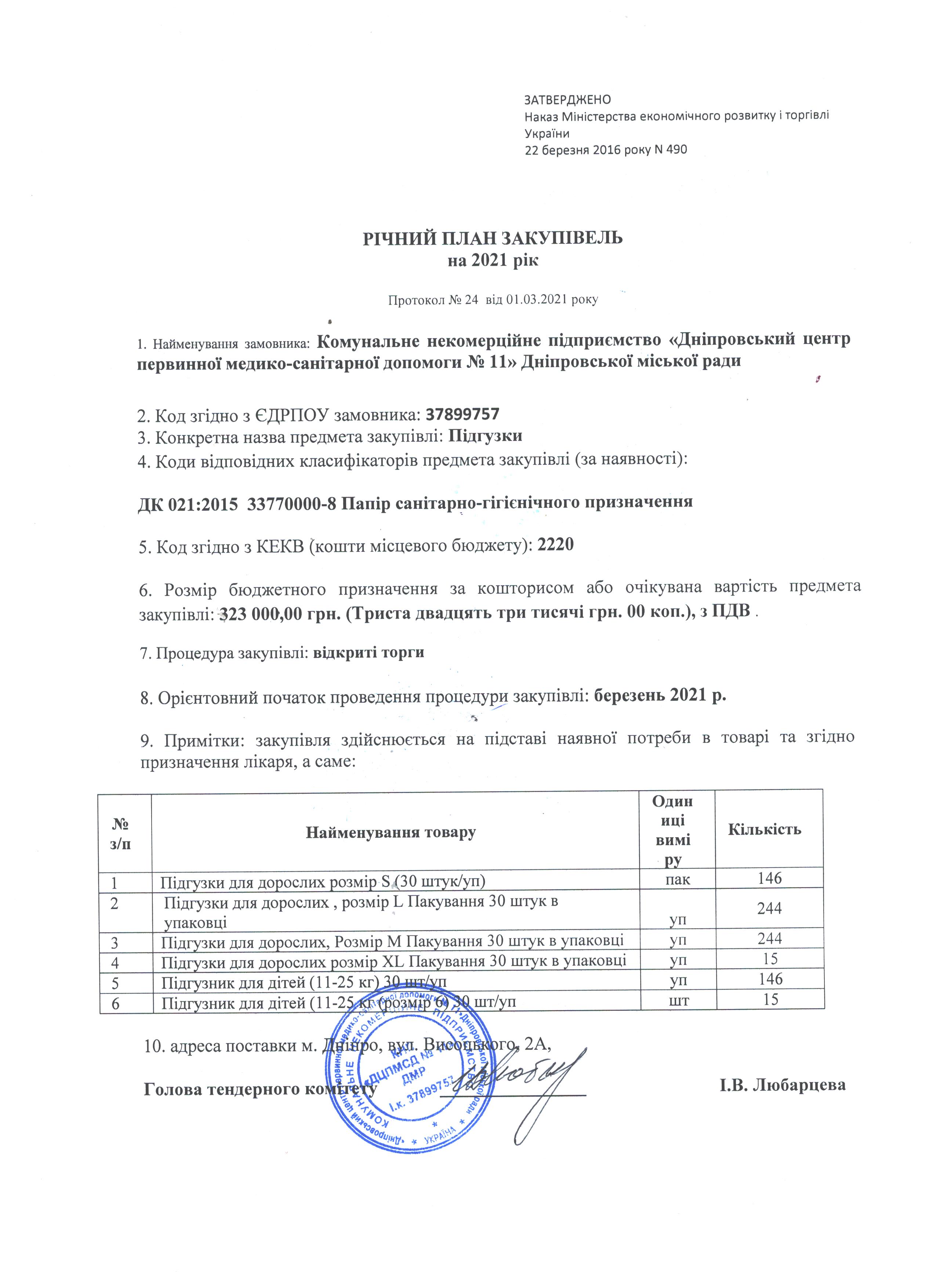 Річний план закупівель на 2021 рік ДК 021:2015 33770000-8 Підгузки